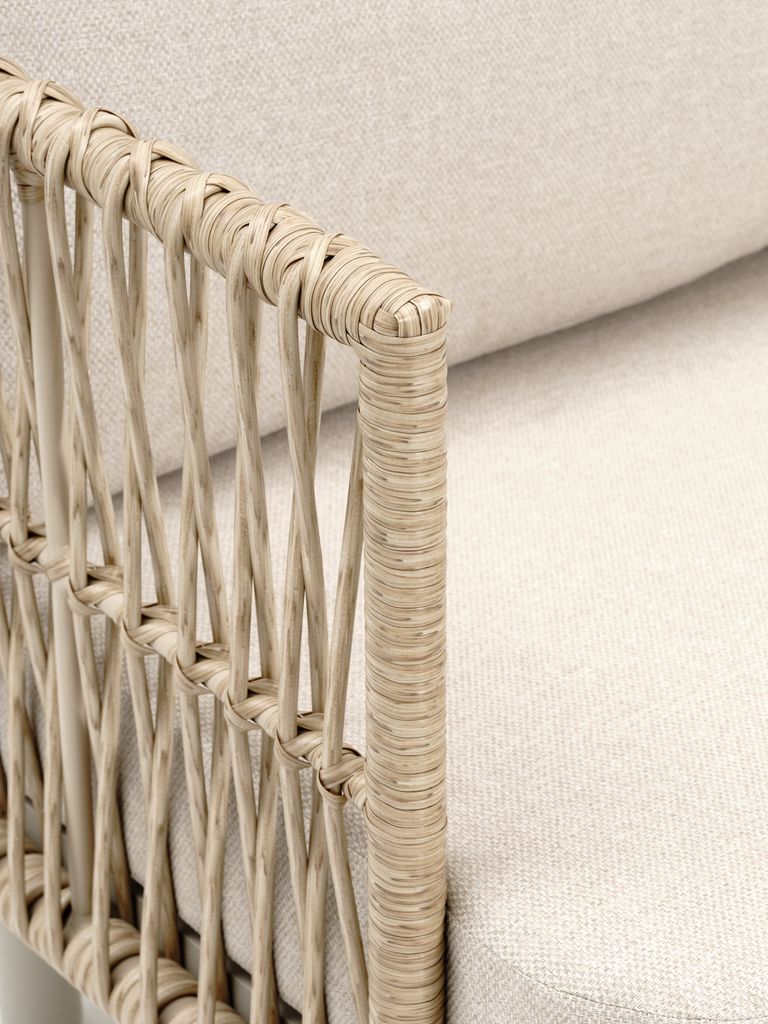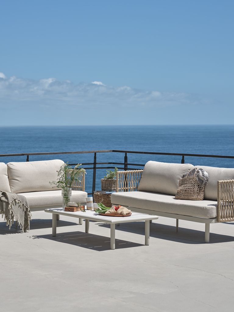 5-θέσιο σαλόνι κήπου. Τραπέζι: Αλουμίνιο και κεραμικά. Π65 x Μ127 x Υ32 cm. 2,5-θέσιος καναπές: Αλουμίνιο και συνθετικό ρατάν. Περιλ. πολυτελή μαξιλάρια με ανθεκτικό κάλυμμα δομής υφαντού.