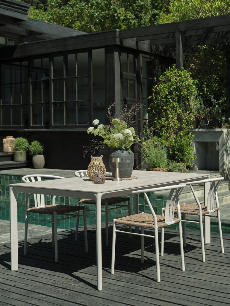 Καρέκλα κήπου με κάθισμα από συνθετικό ρατάν και λευκό σκελετό από αλουμίνιο με επίστρωση βαφής σκόνης. Το συνθετικό ρατάν παρέχει φυσική όψη ψάθας, ενώ είναι ανθεκτικό στις καιρικές συνθήκες και δεν χρειάζεται συντήρηση. Το αλουμίνιο είναι ένα ελαφρύ και στιβαρό υλικό που δεν σκουριάζει.