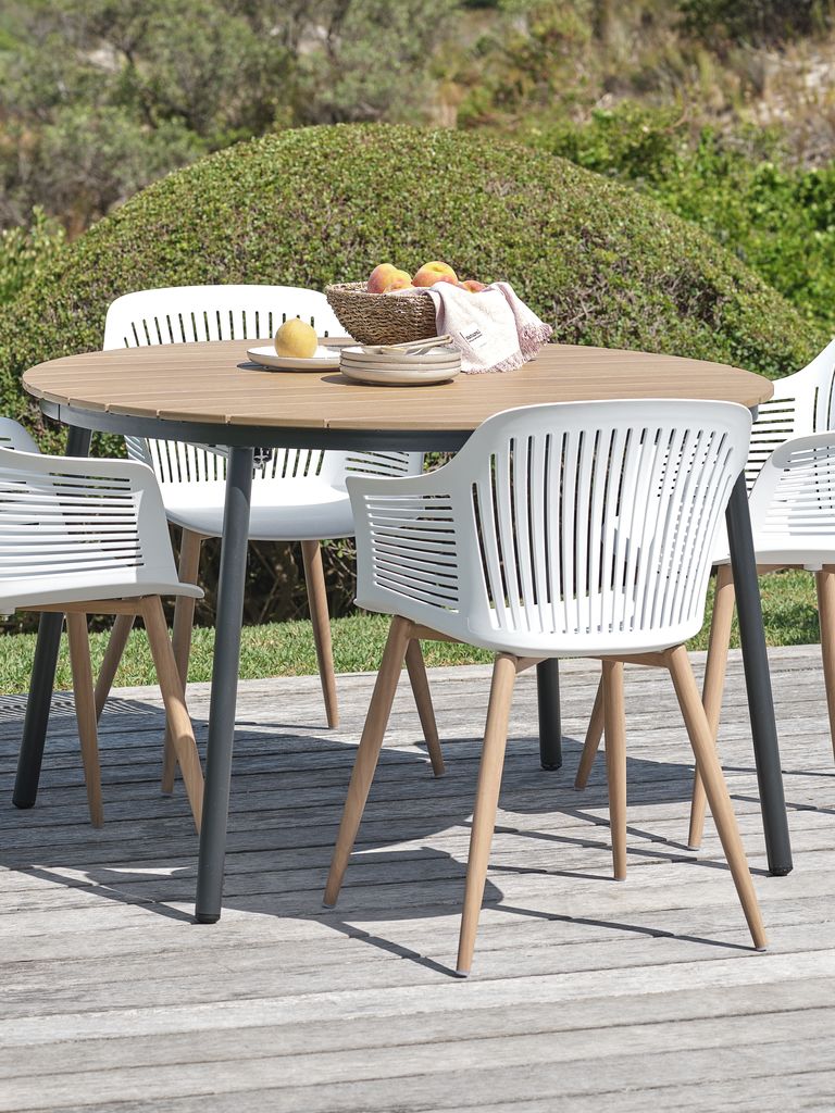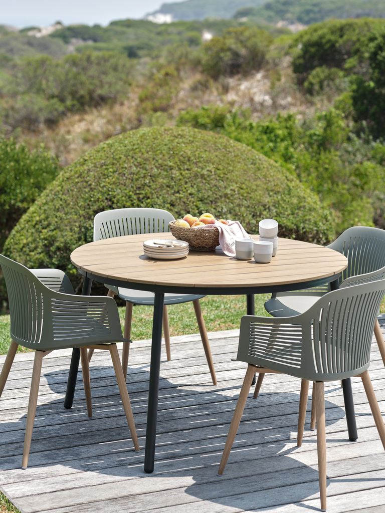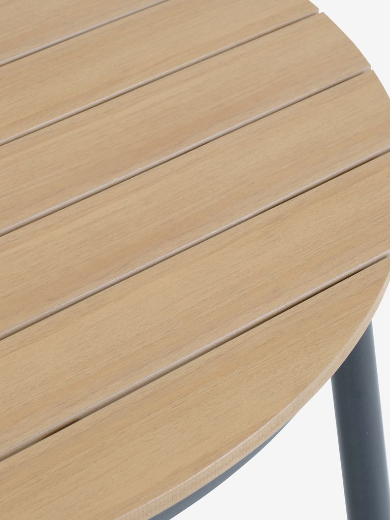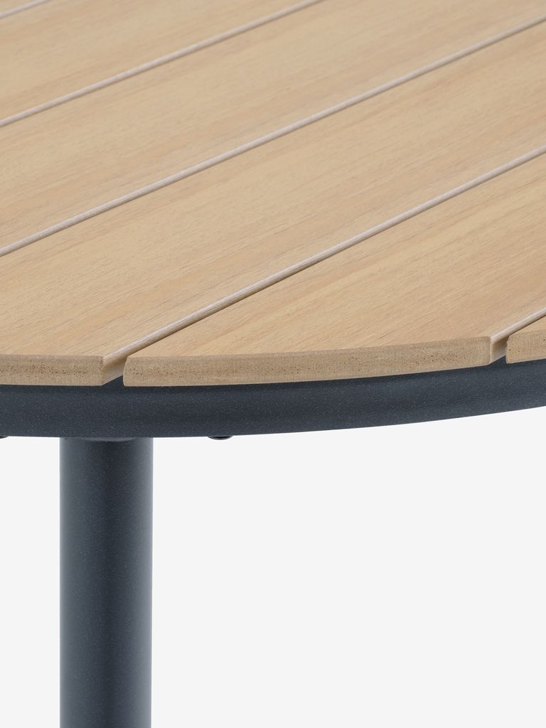 Επεκτεινόμενο τραπέζι κήπου με πτυσσόμενο μηχανισμό, με 1 φύλλο επέκτασης. Το στρογγυλό τραπέζι κήπου διαθέτει επιφάνεια από τεχνητό ξύλο. Μαύρος σκελετός από αλουμίνιο και πόδια από ατσάλι με επίστρωση βαφής σκόνης. Το τεχνητό ξύλο έχει την όψη και την υφή του φυσικού ξύλου χωρίς να χρειάζεται συντήρηση. Το αλουμίνιο είναι ένα ελαφρύ και ανθεκτικό υλικό που δεν σκουριάζει. Μπορείτε εύκολα να επεκτείνετε το τραπέζι στα 168 cm για να φιλοξενήσετε μεγαλύτερες συγκεντρώσεις. Ø118 x Υ75 cm